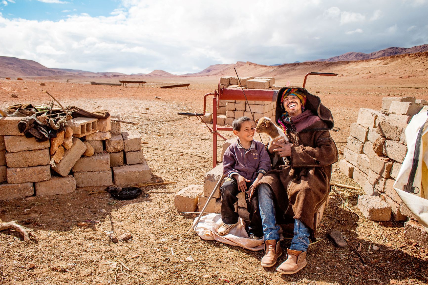 Wildfremde Menschen liefen kilometerweite Umwege, um mich aus dem strömenden Regen zu bergen und liessen mich auf einem Stapel von selbstgeknüpften Teppichen vor dem Feuer übernachten, da es dort wärmer sei als in meinem Zelt. Mit Mostapha presste ich einen Tag lang Olivenöl. Hamid zeigte mir am Markttag den Eselparkplatz und wo ich ein Kamel kaufen könne. Mit Said ging ich zu einer Nomadenfamilie, von welcher ich trotz Armut und Sprachbarriere mit einem köstlichen Essen verwöhnt wurde. Mit Fatima und ihrer Schwester besuchte ich den Hamam. Familie Mabrouk band mir ein Kopftuch um und steckte mich in eine Djellaba, so dass ich in ihrem Restaurant mithelfen konnte, Tajines zuzubereiten. Ich lernte, wie ich Datteln von den Palmen hole, sass marokkanisch in einem Taxi (vier Personen auf dem Rücksitz, drei vorne) und bestieg barfuss Sanddünen.