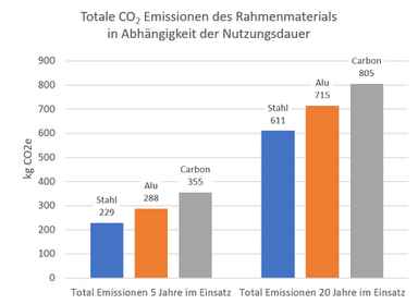 Noch viel höher ist der ökologische Fussabdruck jedoch, wenn anstatt des Schiffs ein Flugzeug für den Transport gewählt wird. Der wichtigste Punkt für ein nachhaltiges Velo mit tiefem CO2-Ausstoss ist die Nutzungsdauer. Für die Berechnung und zum Erarbeiten von Vergleichswerten haben wir folgende Annahmen für die oben ausgeführten Varianten getroffen: Pro Jahr werden mit dem Velo 2500 km zurückgelegt. Das Velo wird gut gepflegt und die Verschleissteile (auch grössere Reparaturen wurden berücksichtigt, beispielsweise einmal einen Ersatz der Laufräder) regelmässig ausgetauscht, damit das Velo 20 Jahre lang ein Begleiter sein kann.