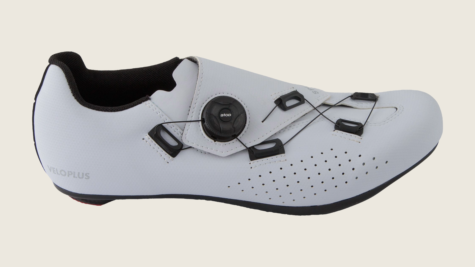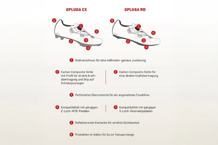 Der Name «SPLUGA» verrät es bereits: Die Suche nach dem perfekten Rennvelo- und MTB-Schuh hat uns via Splügenpass nach Italien geführt. Dort wird der SPLUGA nämlich produziert und garantiert kurze Transportwege in unsere Veloplus-Läden. Der SPLUGA-Schuh verfügt über eine steife Carbonsohle für eine optimale Kraftübertragung, ein Drehverschluss sorgt für eine gleichmässige Druckverteilung und ermöglicht einen schnellen Ein- und Ausstieg und dank des perforierten Obermaterials bleiben die Füsse stets gut belüftet.