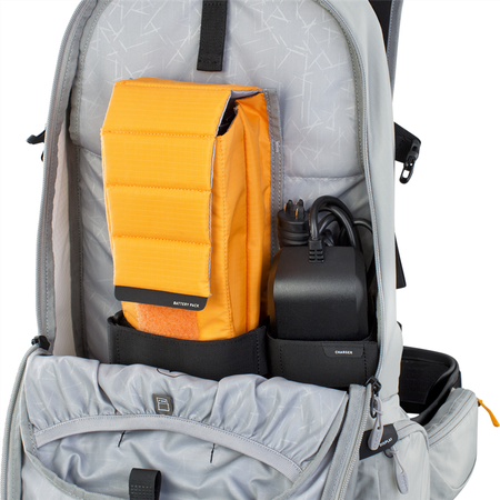 Mit dem FR ENDURO E-RIDE Protektorenrucksack bietet EVOC die Möglichkeit, den Ersatz-Akku und das Ladegerät rutschfest zu verstauen, damit im Falle eines Sturzes Körper und Akku geschützt sind. Die zentrale Akkufixierung nahe am Körperschwerpunkt garantiert einen hohen Tragkomfort. Im Akku-Fach können dank Klappdeckel Akkus bis 460mm Länge transportiert werden. Das spezielle Aussenfach für abnehmbare E-Bike-Displays oder das Navi sowie der Akku-Schlüsselanhänger runden die E-Bike spezifische Ausrüstung ab. Natürlich sind auch Brillen-, Trinkbeutel-, Werkzeugfach und Organizer vorhanden. Der Liteshield-Air-Rücken und der breite Airo-Flex-Hüftgurt sorgen für Atmungsaktivität und optimale Gewichtsverteilung.