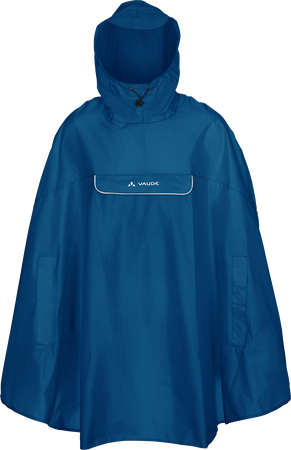 Der Poncho ist aus wasser- und winddichtem Material gefertigt und verfügt über eine praktische Front- bzw. Packtasche, in der der Poncho verstaut werden kann, wenn er nicht benötigt wird. Zudem sind zwei seitliche Eingriffe vorhanden, die es ermöglichen, schnell und einfach auf Taschen oder Gegenstände darunter zuzugreifen. Die Handschlaufen sorgen dafür, dass der Poncho auch bei starkem Wind an Ort und Stelle bleibt. Zusätzlich sind Reflektoren angebracht, die die Sichtbarkeit bei schlechten Lichtverhältnissen verbessern. Das Material der Regenponchos ist Bluesign-zertifiziert und PFC-frei ausgerüstet. Der Regenponcho ist ein Green Shape-Produkt, das bedeutet, dass er nach den Nachhaltigkeits-Standards von Vaude gefertigt wurde.