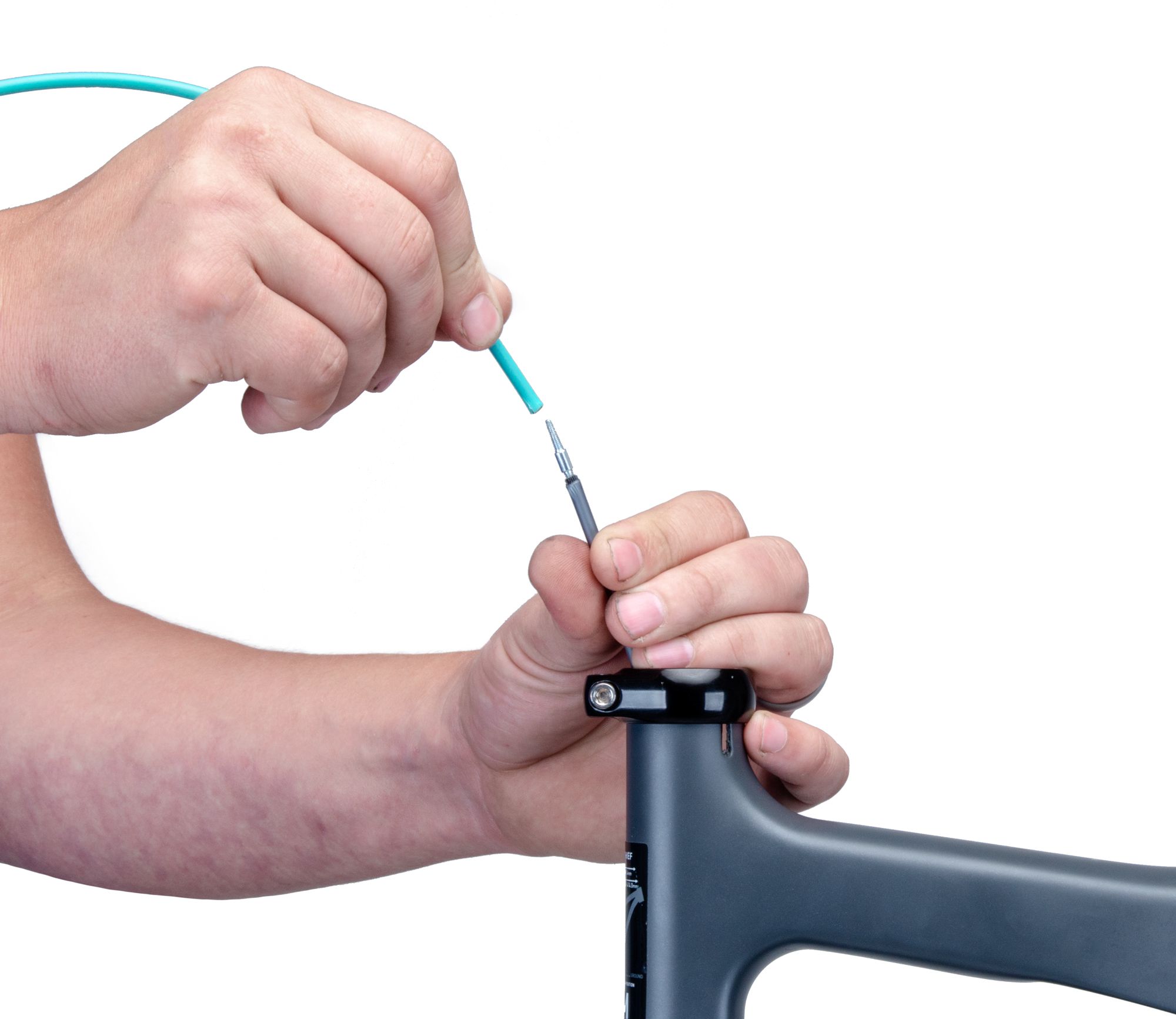 Montageset zum Verlegen von Kabeln, Hüllen und Hydraulikeitungen im Velorahmen. Vier Kabel mit unterschiedlichen Anschlüssen und ein Führungsmagnet helfen bei jedem noch so verzwickten Montageproblem.