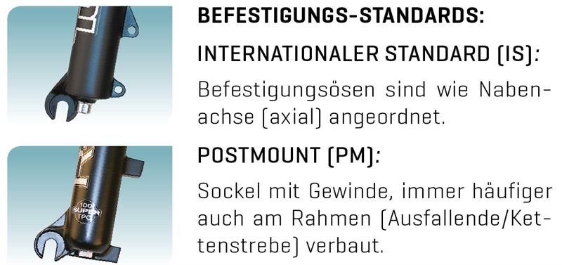 -PM (Postmount) Sockel mit Gewinde, heute praktisch an allen Gabeln und immer häufiger auch am Rahmen (Ausfallende/Kettenstrebe) verbaut.