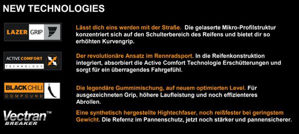 12% weniger Rollwiderstand, 20% mehr Pannenschutz und 10% leichter als sein Vorgänger GP 4000 S II. Die Hightech-Gummimischung "Black-Chilli", bestehend aus Kautschuken in Form von Nanopartikeln, ermöglichen beste Rollwerte. Interessant ist auch der gut funktionierende Pannenschutz in dieser Gewichtsklasse der Leichtbau-Reifen. Der revolutionäre Schutzgürtel aus Vectran, einem thermoplastischen mehrfaserigen Garn, ist besonders leicht, extrem belastbar, ermüdungsresistent und sogar fünfmal stärker als Stahl. Der GRAND PRIX 5000 ist die eierlegende Wollmilchsau und überzeugt durch und durch... Für Training und Wettkampf! (D)