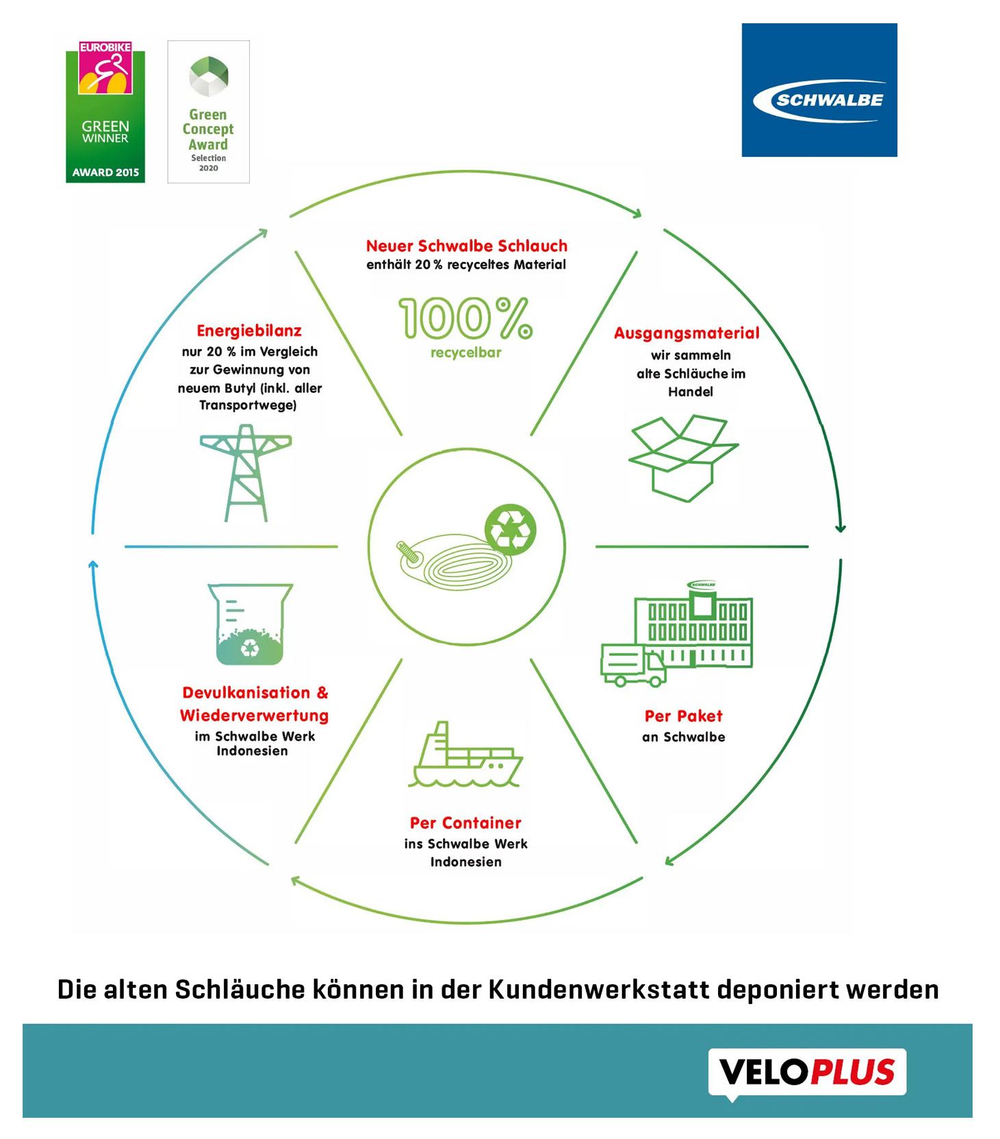 HINWEIS ZUM RECYCLING: Alle Butyl-Schläuche können kostenlos in den Veloplus-Läden in der Kundenwerkstatt abgegeben werden. Die Schläuche werden dem Recycling-Prozess von Schwalbe übergeben. Weitere Informationen finden Sie in unserem Blog:
